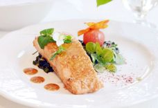 Стейк из лосося со сливочным соусом, черри и шпинатом
