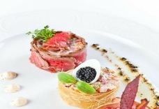 Оливье с копченой курицей, перепелиным яйцом и черной икрой
